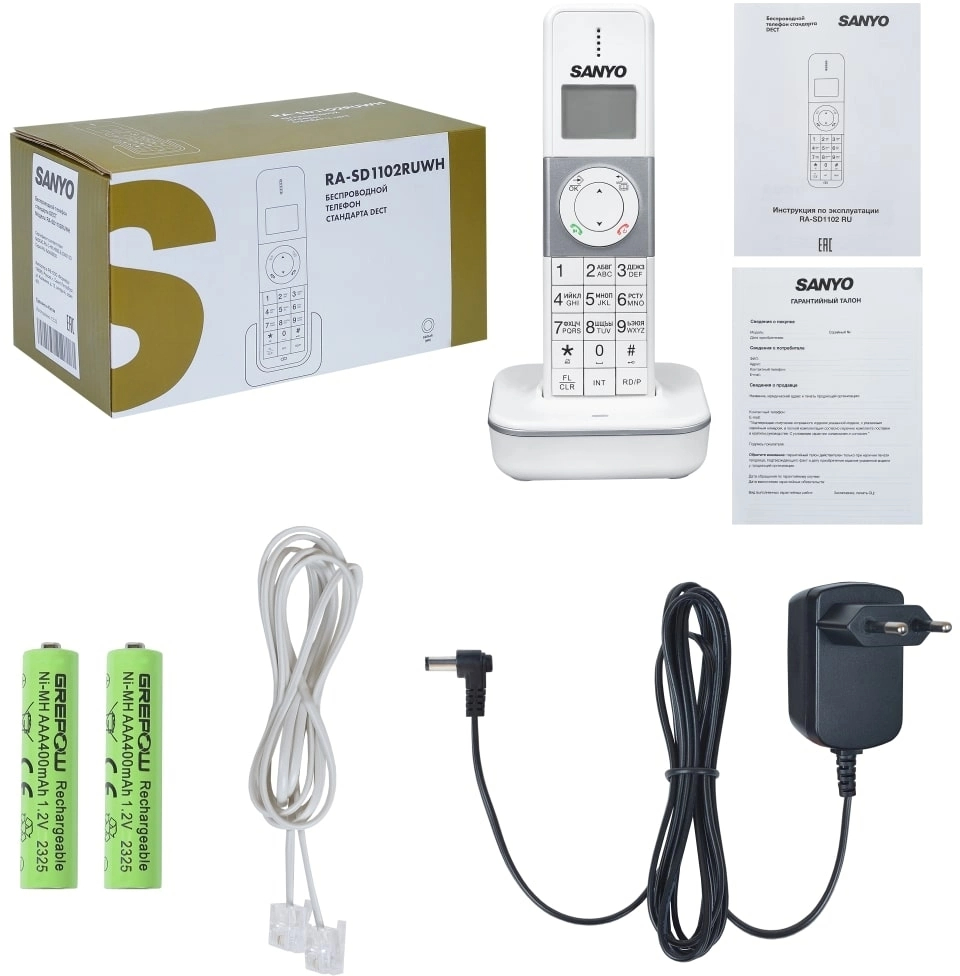 DECT-телефон Sanyo - RA-SD1102RUWH, outdoor range 100m, indoor range 30m, standby time 100h, talk time 8h, 1-handset, phone book 50 numbers, key illumination, белый, RA-SD1102RUWH