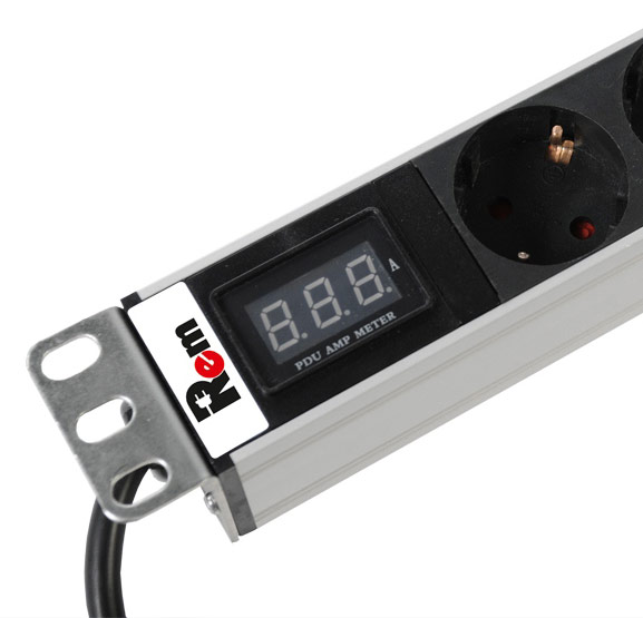 Блок с 8 розетками и амперметром. Токовая нагрузка отображается в реальном времени — удобно для мониторинга. Корпус металлический, крепление в 1U.