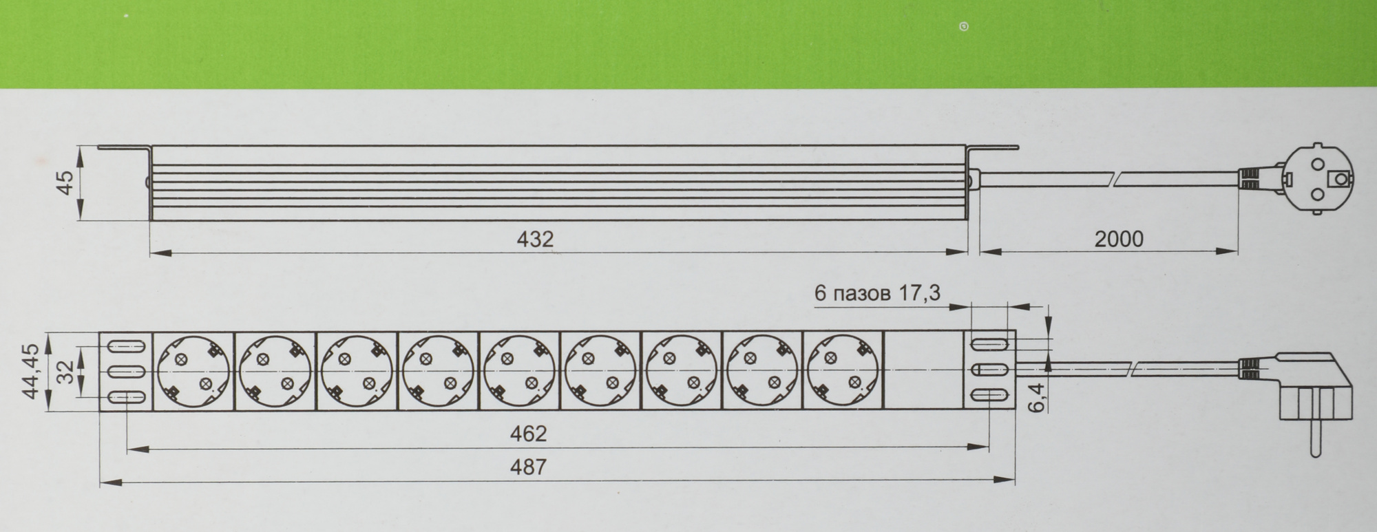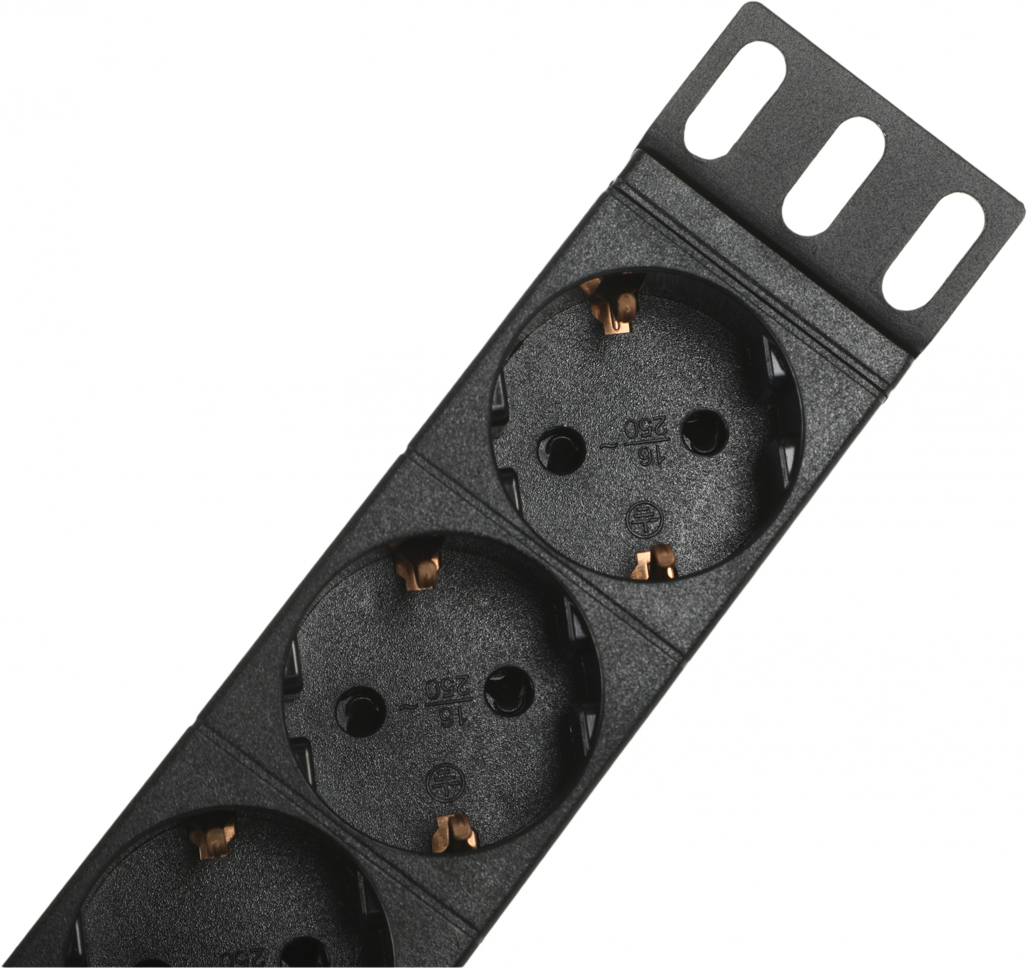 9 розеток EU с двойной изоляцией. Нагрузка до 25А, индикация заземления. Крепление в 1U, кабельные вводы для аккуратной организации проводов.