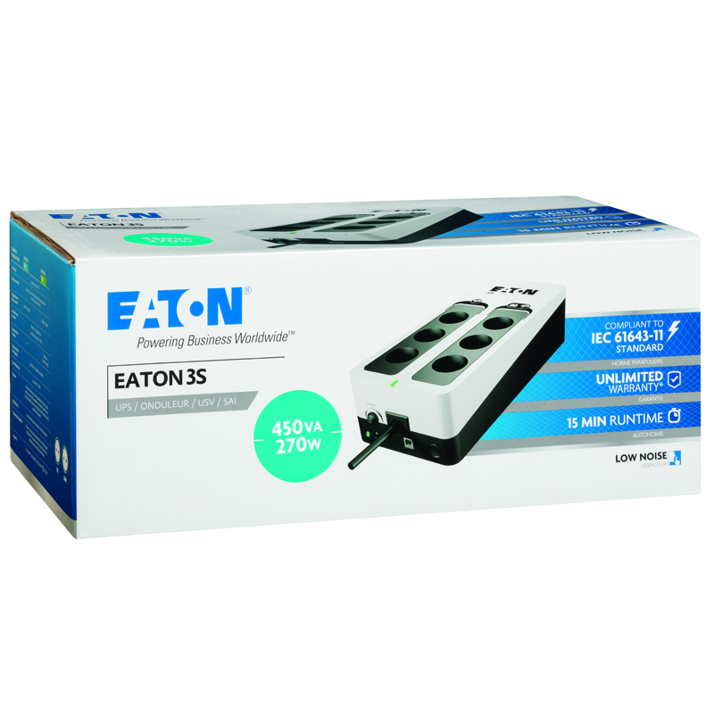 ИБП Eaton - 3S Gen2 450 ВА/270 Вт, OFF-Line, in (230V Сетевой шнур (Schuko)), 6xSchuko, Brick, цвет чёрно-белый, 3S450D