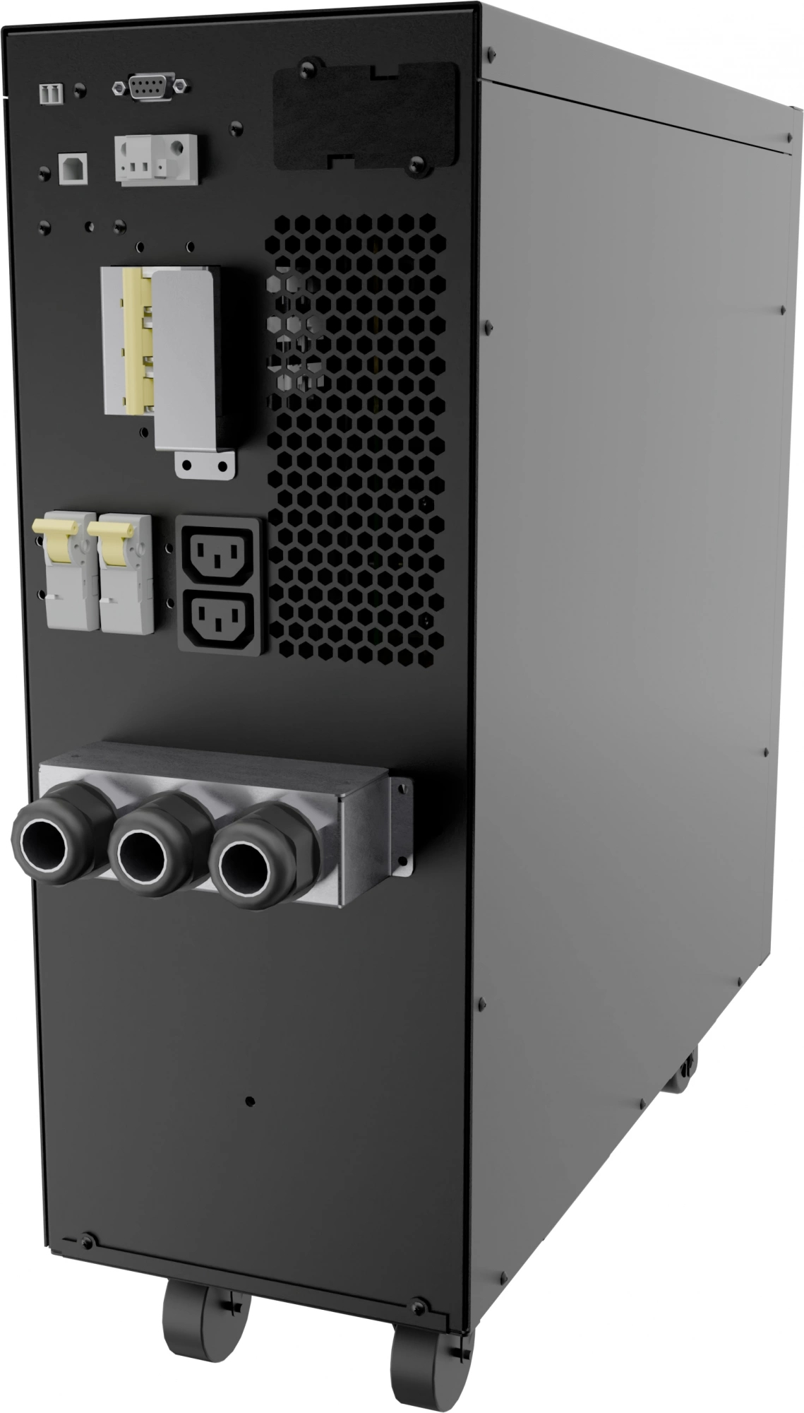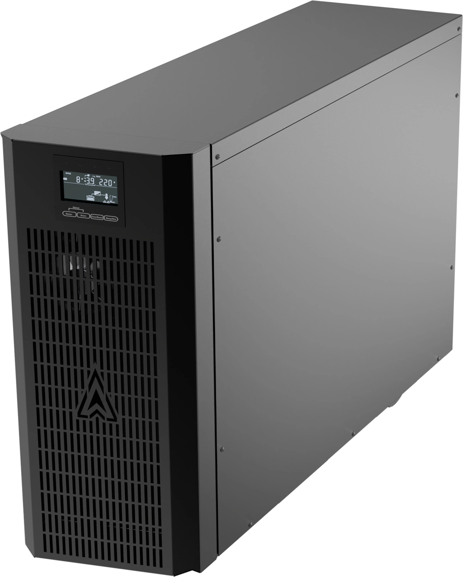 Модель на 6000 ВА, обслужит большую группу серверов или несколько станков управления. Онлайн-схема, выходная мощность достаточно высокая. Монтируется на полу, массивный, но эффективный.
