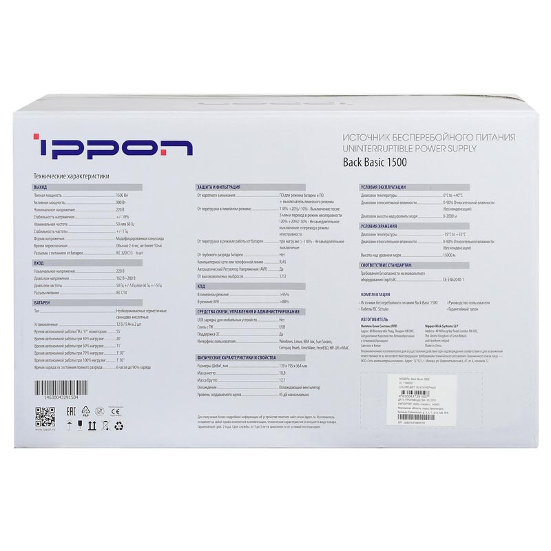 ИБП Ippon - Back Basic 1500 ВА/900 Вт, Line-Interactive, in (220V 1xIEC-320 C14), 6xIEC-320 C13, Tower, цвет чёрный, 1108030
