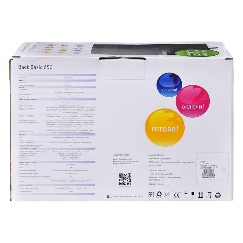 ИБП Ippon - Back Basic 650 ВА/360 Вт, Line-Interactive, in (220V Сетевой шнур (Schuko)), 3xIEC-320 C13, Tower, цвет чёрный, 337477