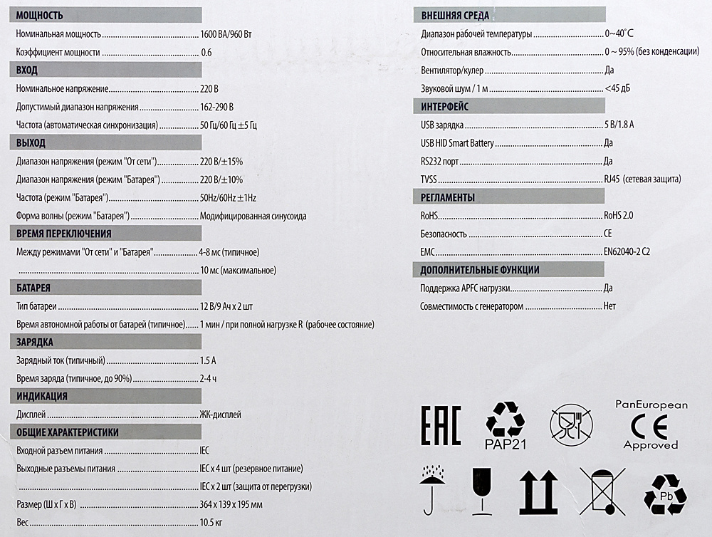 Увеличенная мощность для более требовательных нагрузок — игровой ПК или маленький офис. Дисплей показывает нагрев, заряд, входное/выходное напряжение. Звуковой сигнал при переходе на батарею не слишком громкий, но предупреждает вовремя.