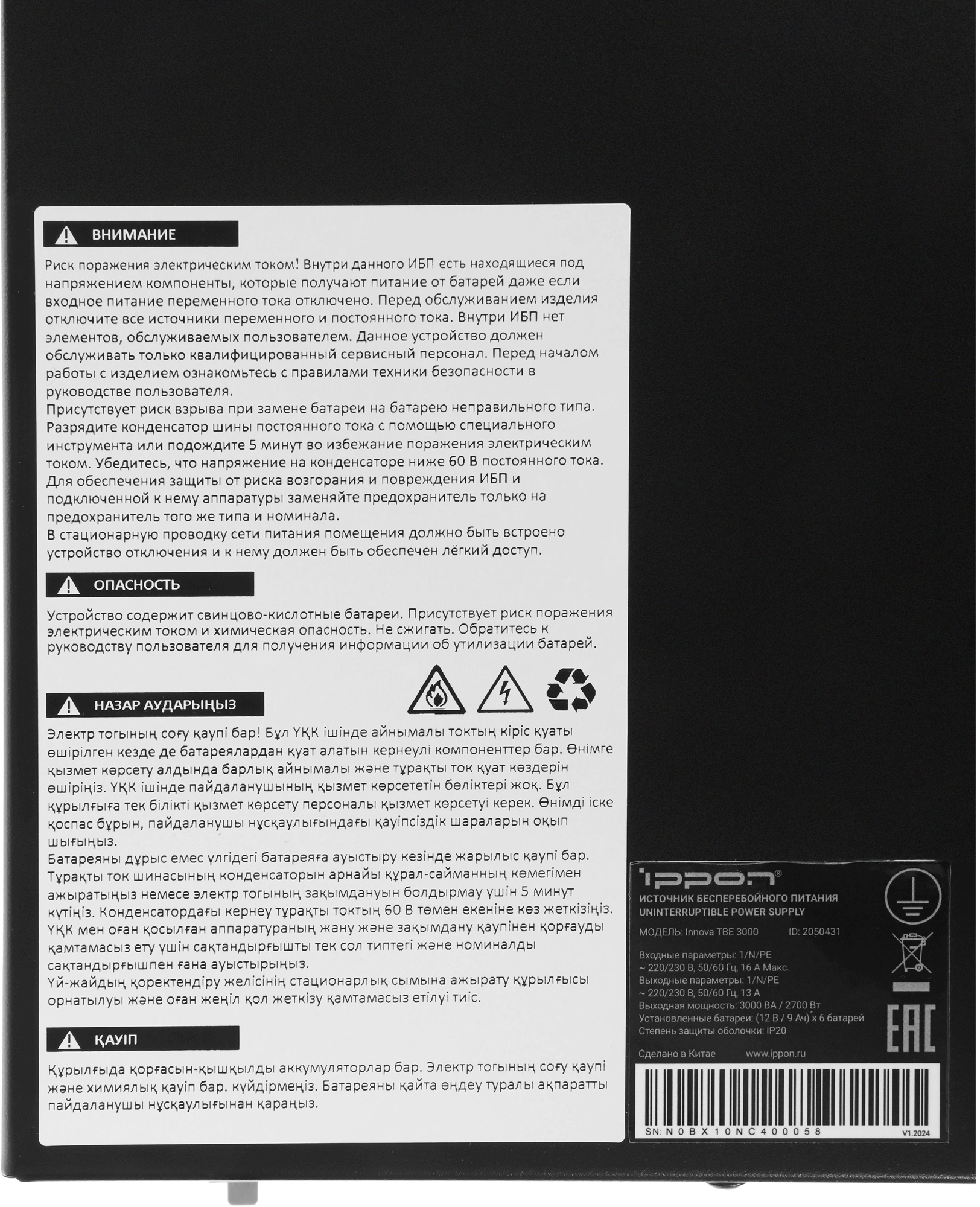 ИБП Ippon - TBE 3000 ВА/2700 Вт, On-Line, in (1xIEC-320 C20), 4xSchuko, terminal block, LCD, Tower, цвет чёрный, 2050431