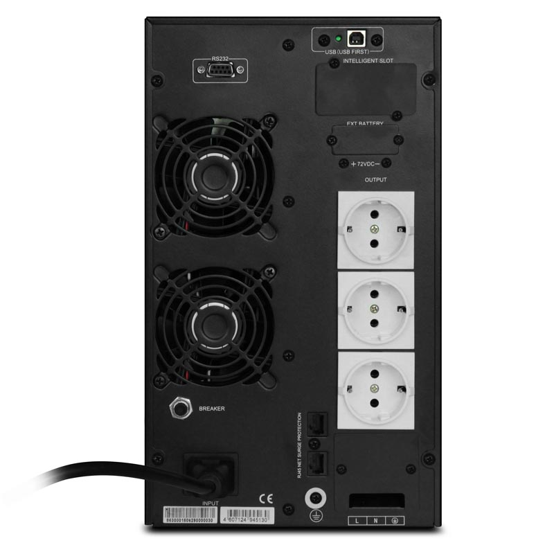 Готовая онлайн-модель на 3000 ВА с внутренними АКБ. Удобно для серверов: чистое напряжение, нет рывков при переходе на батарею. Дисплей даёт параметры — вход, выход, заряд. Форм-фактор башня, весит немало, но сборка добротная и не греется.