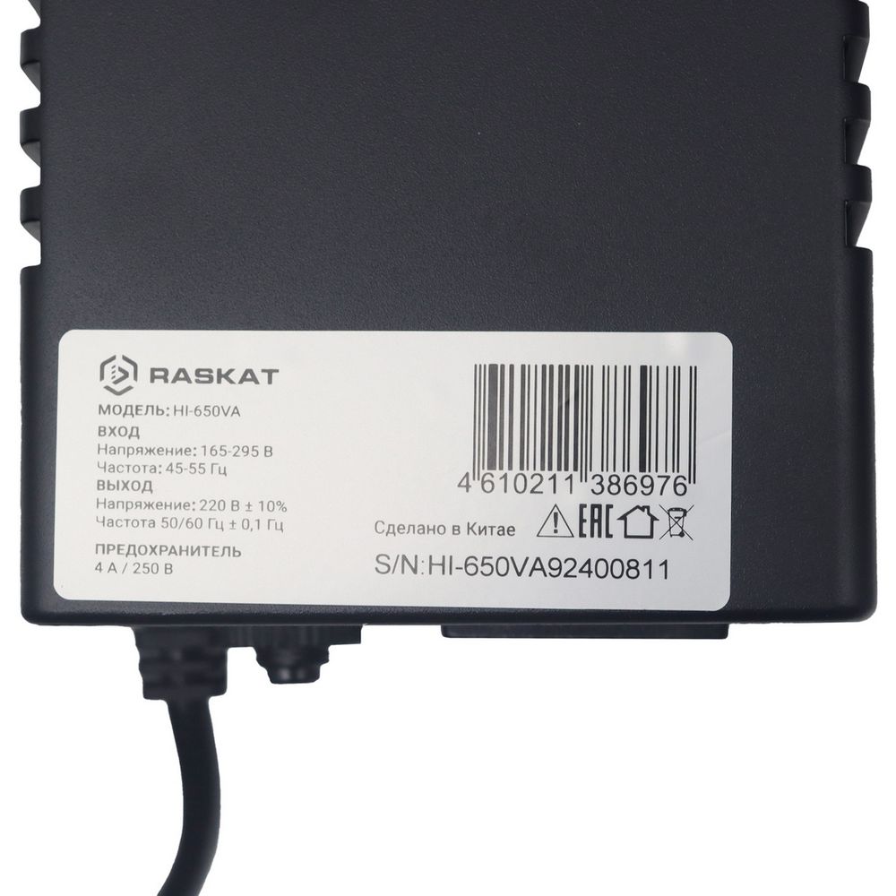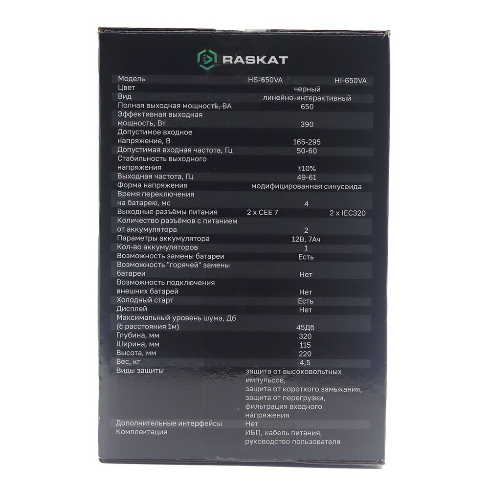 ИБП Raskat - HI 650 ВА/390 Вт, Line-Interactive, in (220V), 2xIEC-320 C13, Tower, цвет чёрный, HI-650VA