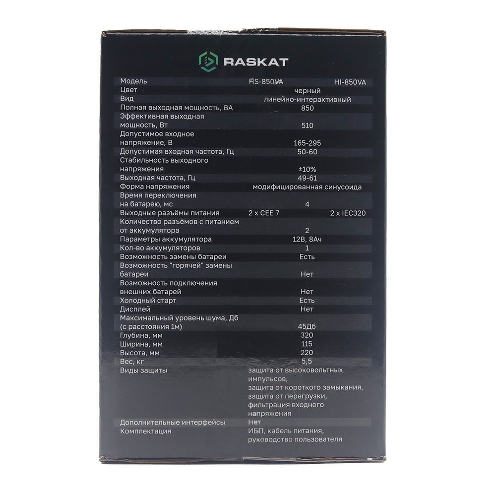 ИБП Raskat - HI 850 ВА/510 Вт, Line-Interactive, in (220V), 2xIEC-320 C13, Tower, цвет чёрный, HI-850VA
