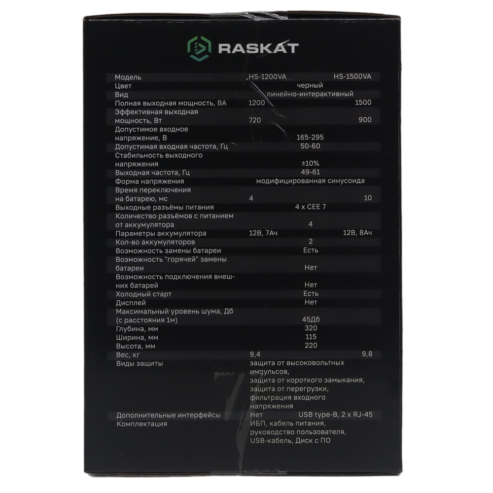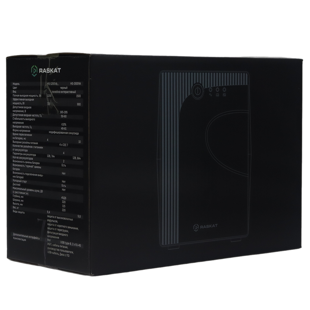 ИБП Raskat - HS 1500 ВА/900 Вт, Line-Interactive, in (220V Сетевой шнур (Schuko)), 4xSchuko, Tower, цвет чёрный, HS-1500VA