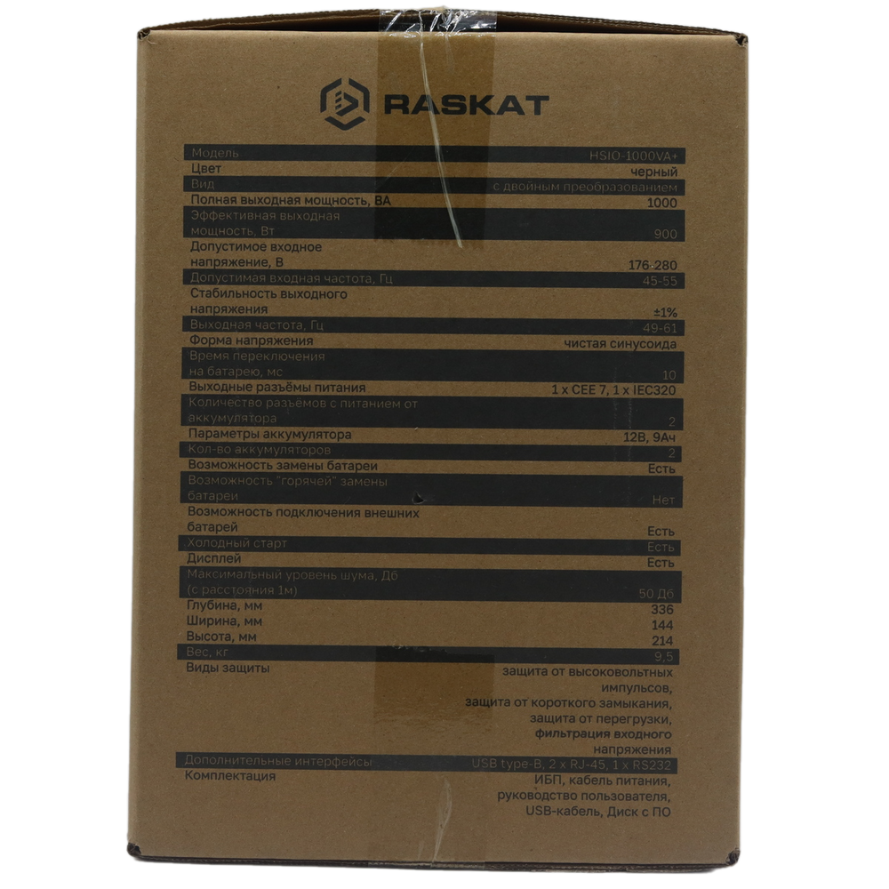 ИБП Raskat - HSIO 1000 ВА/900 Вт, Line-Interactive, in (220V), 1xSchuko, 1xIEC-320 C13, LCD, Tower, цвет чёрный, HSIO-1000VA+
