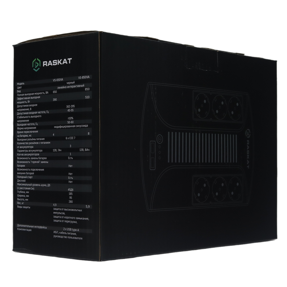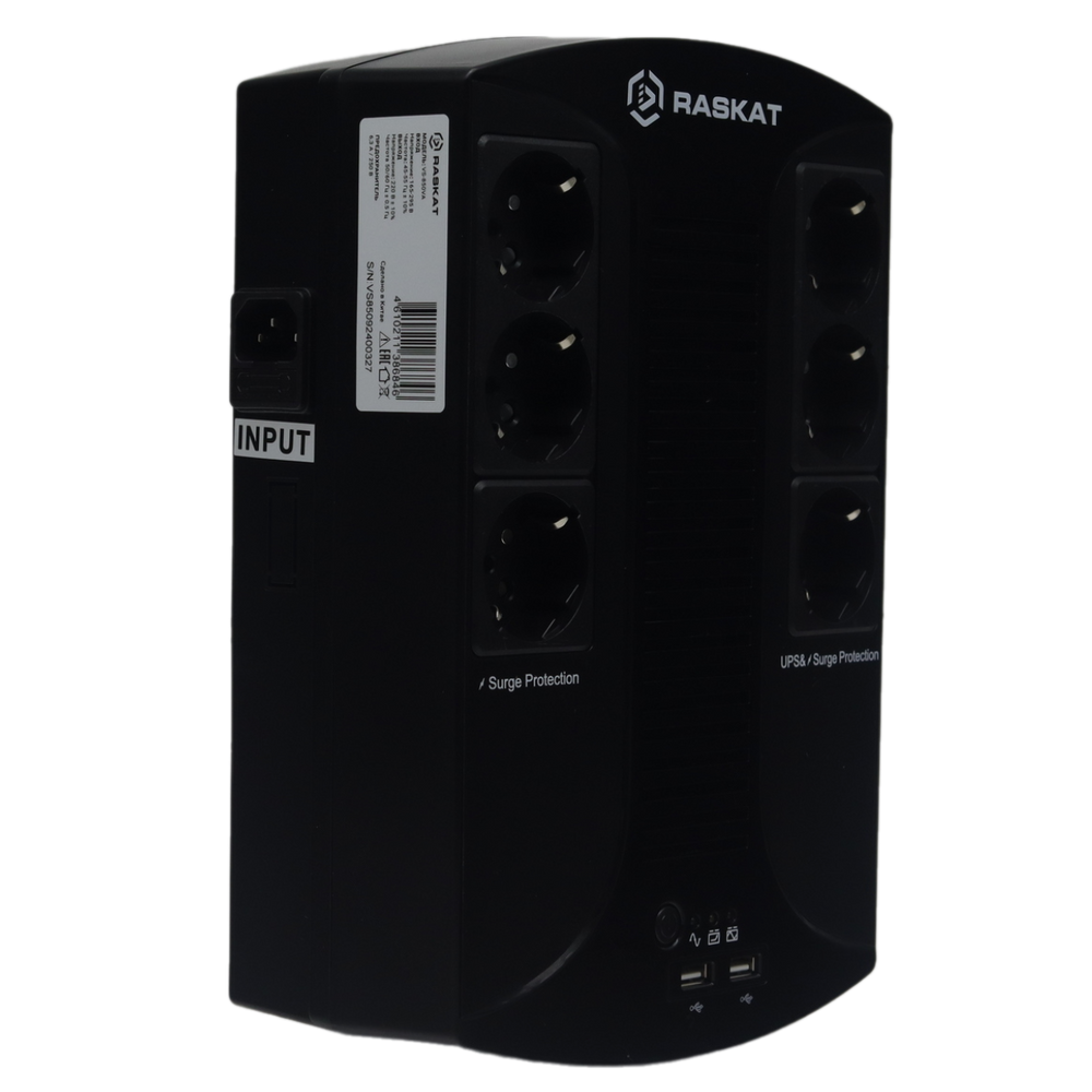 ИБП Raskat - VS 850 ВА/510 Вт, Line-Interactive, in (220V 1xIEC-320 C14), 6xSchuko, Tower, цвет чёрный, VS-850VA