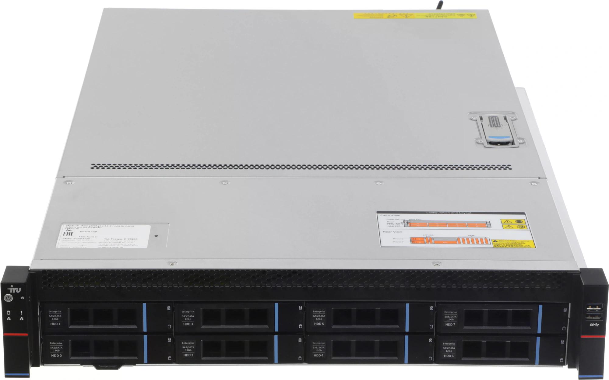 Сервер iRU - g2208ig3, 2xIntel Xeon Gold 5315Y 3200МГц, DDR4 4x32ГБ, 16хDDR4, 8x3.5", 2x2.5"-rear, On board RAID, 2x1GbE, 2x800W, Aspeed AST2500, Rack, 2U, 2136230